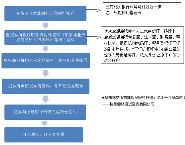 林交所開戶流程:1、交易商至結(jié)算銀行(建行、杭州銀行)開立銀行賬戶(已有相關(guān)銀行借記卡賬號(hào)可跳過(guò)這一步)。2、至交易所授權(quán)服務(wù)機(jī)構(gòu)處(如:磐林投資)填寫《華東林業(yè)產(chǎn)權(quán)交易所入市協(xié)議》等相關(guān)資料。3、授權(quán)服務(wù)機(jī)構(gòu)(如:磐林投資)錄入客戶資料,并分配交易賬號(hào)。4、交易所審核交易商資料,并開通交易賬號(hào)。5、交易商通過(guò)銀行網(wǎng)銀完成賬號(hào)簽約。6、開戶成功,可入金交易。